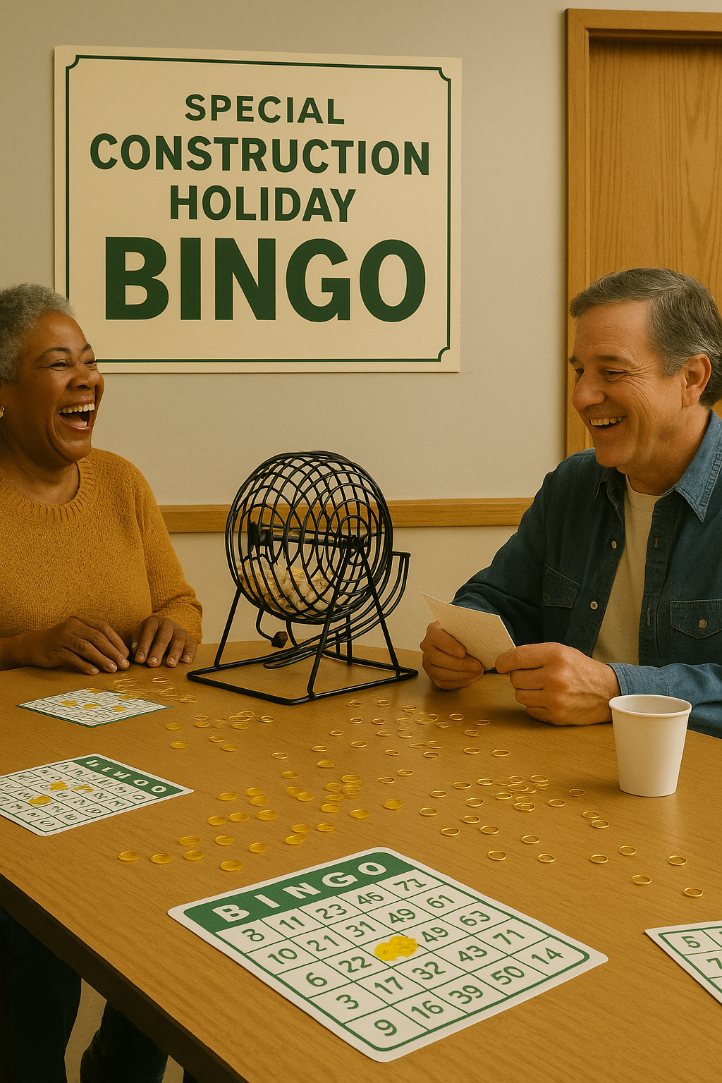 Joignez-vous à nous à la salle communautaire pour une soirée de bingo festive à l’occasion des Vacances de la Construction ! Rires, prix amusants et ambiance conviviale au rendez-vous. Activité ouverte à tous — n’oubliez pas votre porte-bonheur !